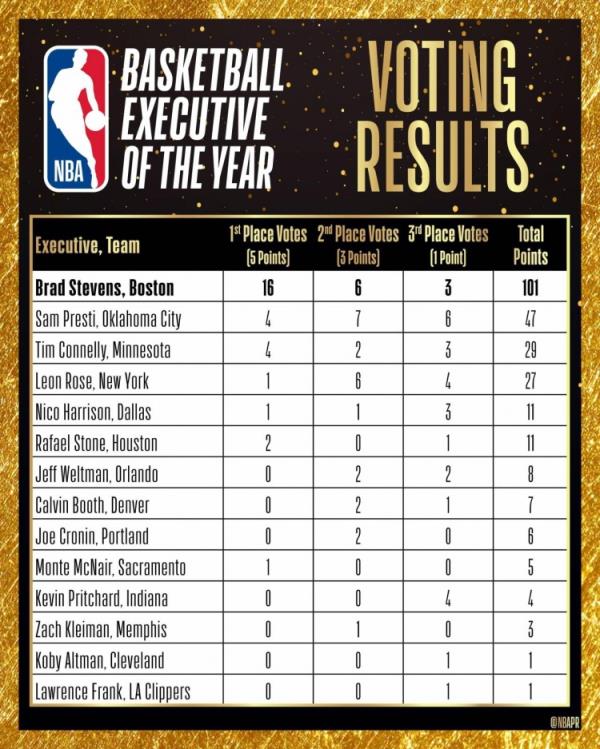 5月1日讯 NBA官方宣布,凯尔特人篮球运营总裁布拉德-史蒂文斯当选NBA年度最佳高管,详细投票情况如下: