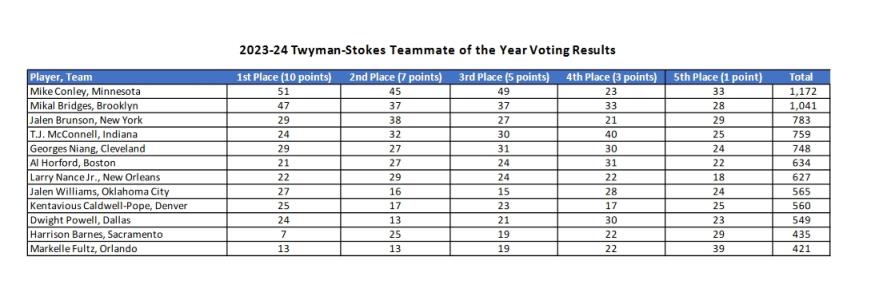 05月02日讯 NBA官方宣布,森林狼后卫迈克-康利荣获2023-24赛季NBA最佳队友奖!