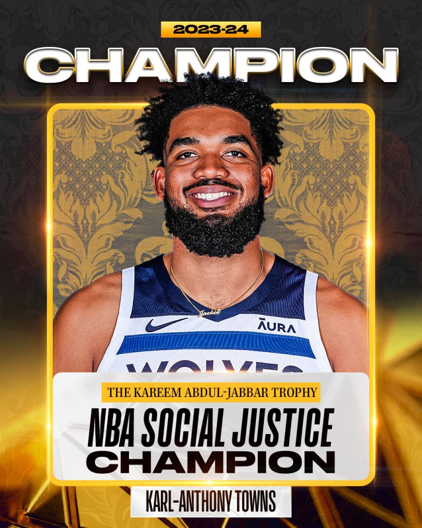 05月10日讯 NBA官方今日宣布,森林狼球员唐斯获得2023-24赛季NBA社会正义冠军,将领取贾巴尔奖杯。