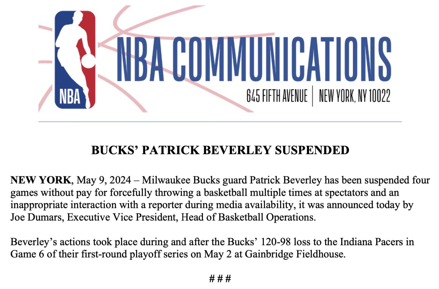 05月10日讯 NBA官方今日公告:贝弗利用球多次砸球迷+对记者不敬,被停薪禁赛4场,禁赛将从下赛季开始执行。