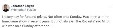 火箭记者Jonathan Feigen表示,乐透抽签很少在周日进行,而且最近几年都在晚上的黄金时段进行。但火箭抽到选中姚明的状元签是在周日的下午。
