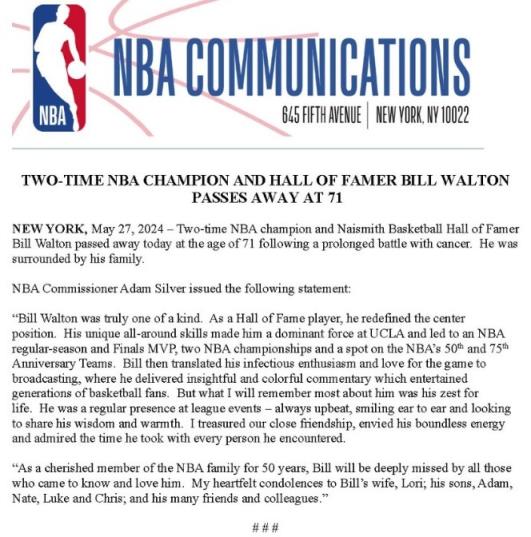 “作为NBA大家庭50年来备受珍视的一员,比尔-沃顿将被所有认识和爱他的人深深怀念。我向他的妻子洛莉,他的儿子亚当、内特、莱克和克里斯以及他的许多朋友和同事表示衷心的哀悼。”