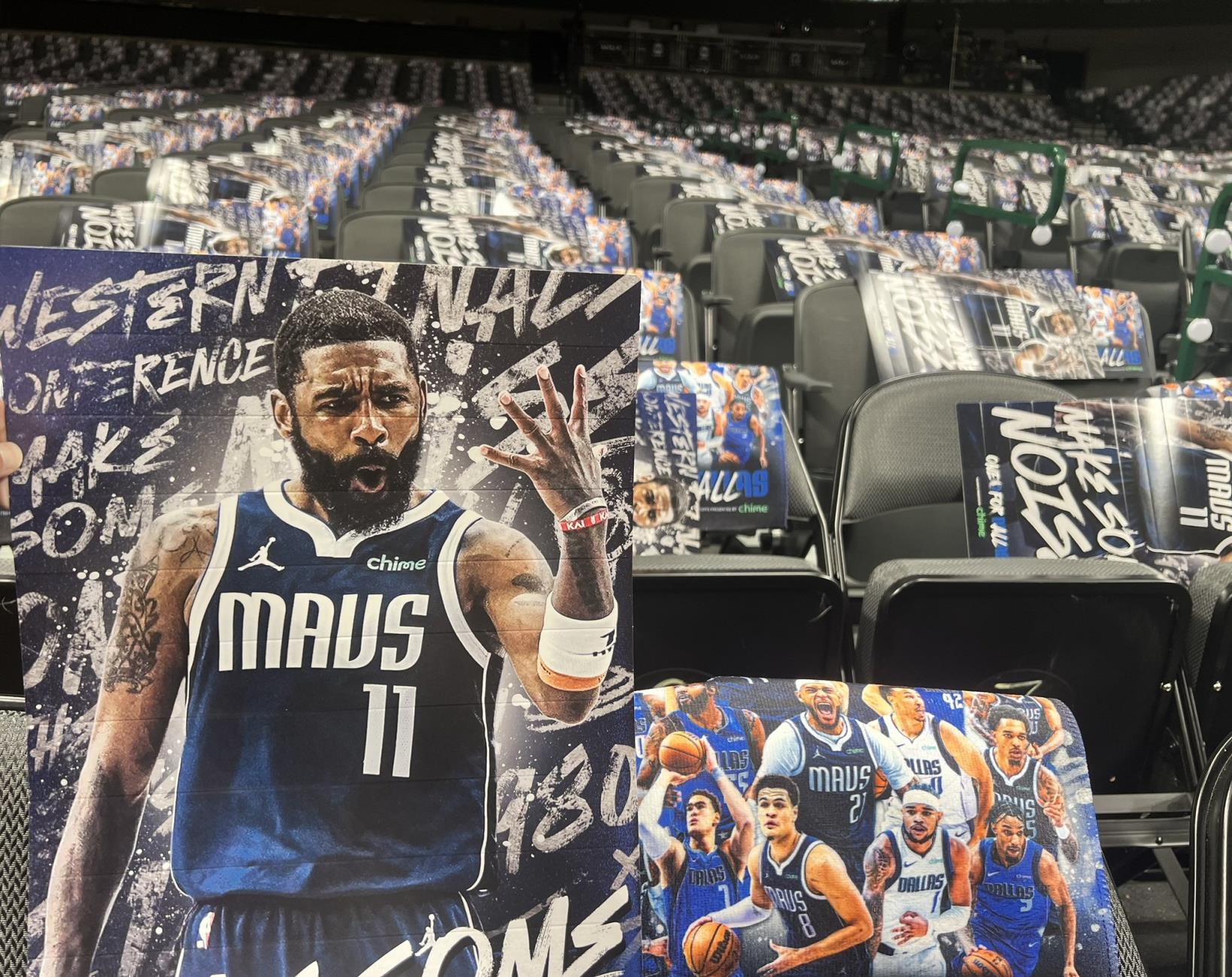 独行侠主场观众席为粉丝们提供的助威海报,是欧文常规赛左手抛投绝杀掘金后的庆祝动作。