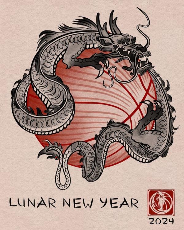 图片上画着一条龙缠住篮球,配文写道:“祝全球的侠蜜们,龙年快乐