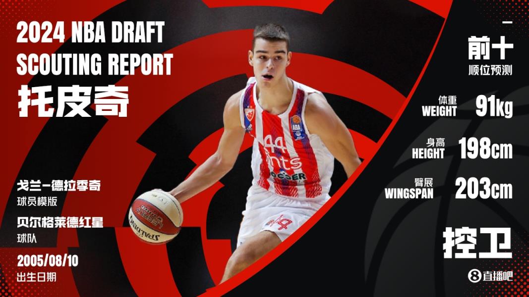 06月05日讯 据ESPN选秀专家Jonathan Givony报道,经纪人称,2024年选秀前十热门、塞尔维亚控卫托皮奇的体检结果显示其左膝前十字韧带部分撕裂。