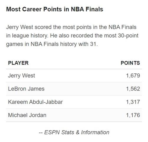 据统计,韦斯特目前仍然是NBA总决赛的历史得分王,力压詹姆斯、贾巴尔和迈克尔-乔丹。