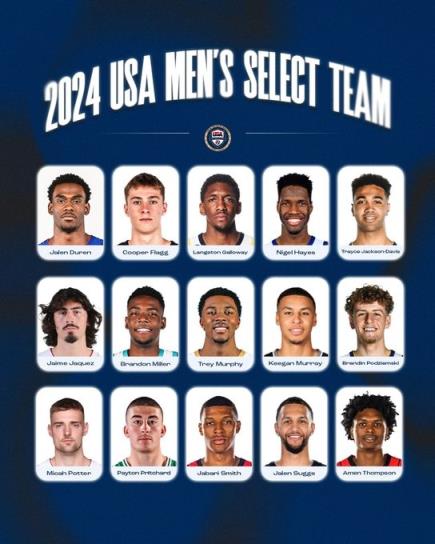 6月29日讯 今天,美国男篮公布了2024年选拔队的名单,明年状元大热弗拉格在列。