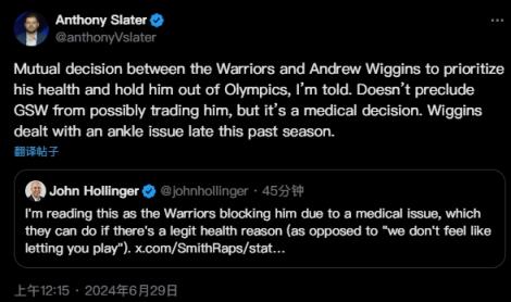 勇士队记Slater转发了相关报道并写道:“我被告知,(缺席巴黎奥运会)这是勇士和维金斯彼此共同(Mutual)的选择,他们决定优先考虑他(维金斯)的健康问题。(缺席奥运)并没有排除勇士交易他的可能,这只是一个‘医疗决定(medical decision)’。维金斯在上个赛季末一直在处理脚踝相关问题。”