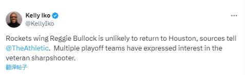 07月01日讯 据The Athletic火箭记者Kelly Iko报道,多位消息人士透露,33岁的侧翼球员雷吉-布洛克不太可能回归火箭,多支季后赛球队对这位老将神射手(sharpshooter)感兴趣。