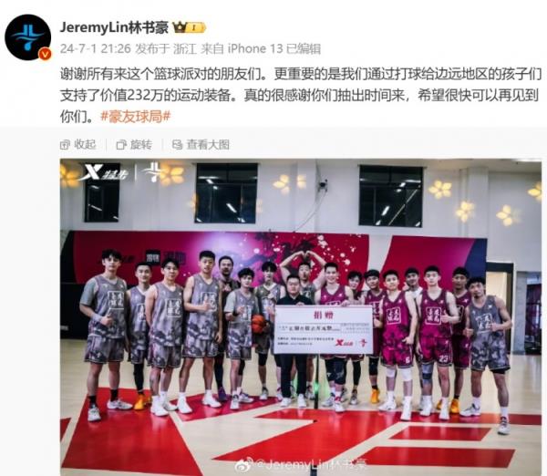 赛后,林书豪发文写道:“谢谢所有来这个篮球派对的朋友们。更重要的是我们通过打球给边远地区的孩子们支持了价值232万的运动装备。真的很感谢你们抽出时间来,希望很快可以再见到你们。”