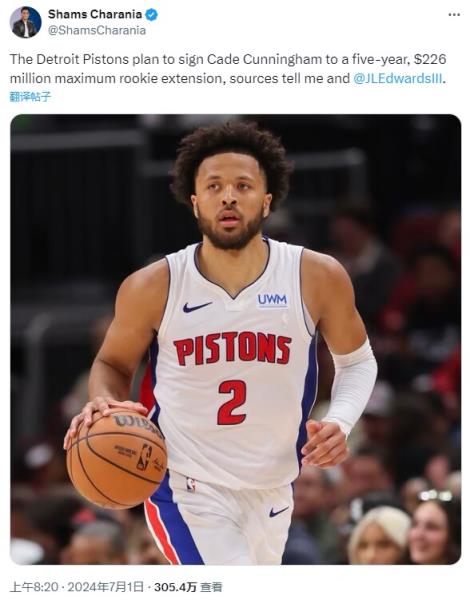 值得一提的是,名记Shams在7月1日就报道了这一消息,当时活塞已经在计划与康宁汉姆签下指定新秀条款。