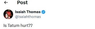 上半场美国男篮阵中的塔图姆没有获得1秒上场时间。前NBA球员小托马斯为塔图姆鸣不平:“塔图姆是受伤了吗??”
