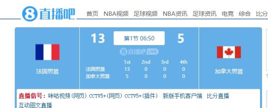 8月7日讯 奥运男篮1/4决赛,法国男篮开场以13-5领先加拿大男篮8分。