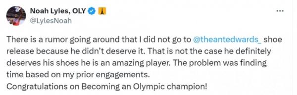 昨天,莱尔斯更推澄清道:“有一个谣言在传播,说我去年没有去爱德华兹的球鞋发布会,因为我觉得他不配。事实并非如此,他绝对配得上他的球鞋,他是一个了不起的球员。我会根据我先前的时间安排来找时间和他解决这个问题。祝贺你成为奥运冠军!”