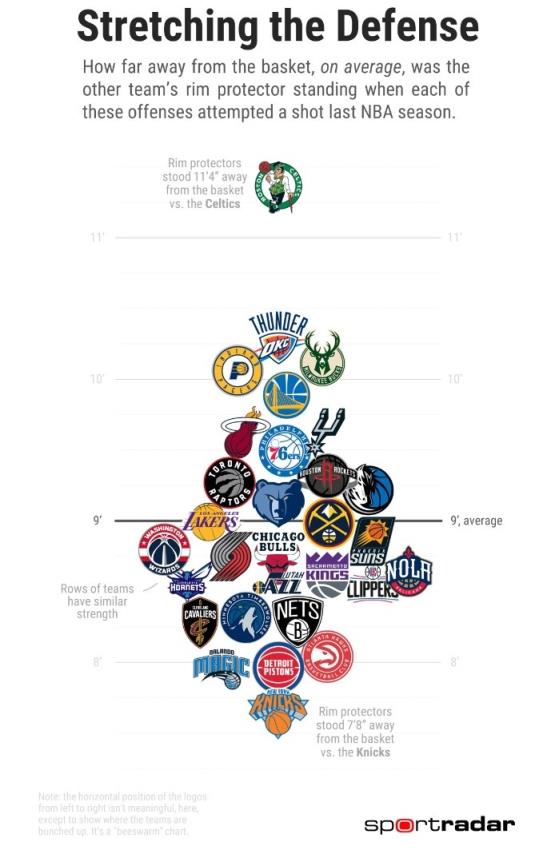 8月20日讯 今天,数据专家Todd Whitehead统计了上赛季,本方球员出手时,对方中锋(护筐人)距离篮筐的平均距离。绿军球员出手时,迫使对手护筐人平均距篮筐3.8米是联盟第一,具体如下图: