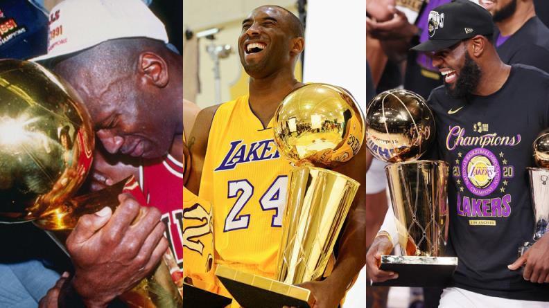 科比在他的职业生涯中赢得了5个NBA冠军(全部在湖人队),乔丹赢得了6个NBA冠军(全部在公牛队),其中包括两次三连冠。