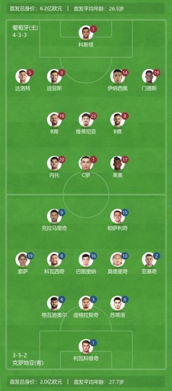葡萄牙首发:1-迪奥戈-科斯塔、3-鲁本-迪亚斯、14-伊纳西奥、5-达洛特、19-努诺-门德斯、23-维蒂尼亚、8-B费、10-B席、20-内托、17-莱奥、7-C罗
