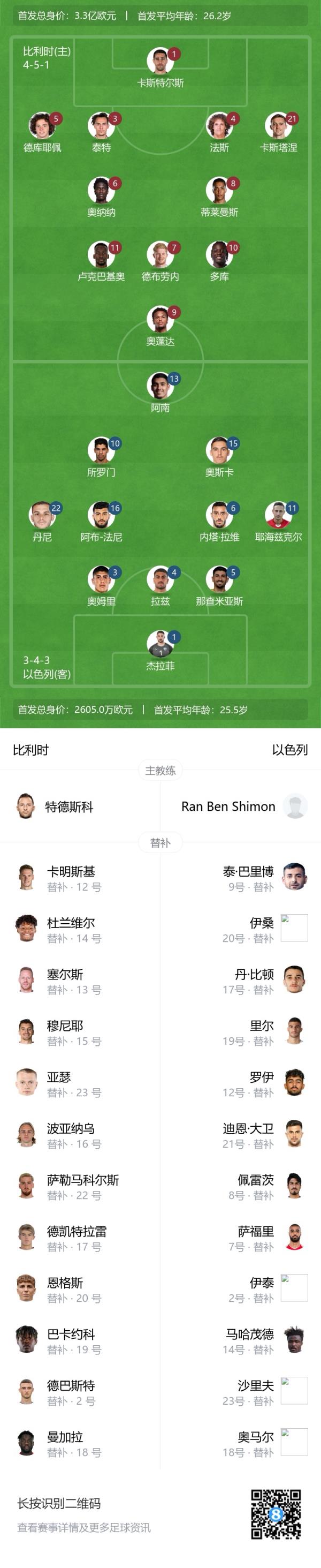 9月7日讯 欧国联A级首轮,比利时vs以色列比赛即将打响。赛前首发出炉。