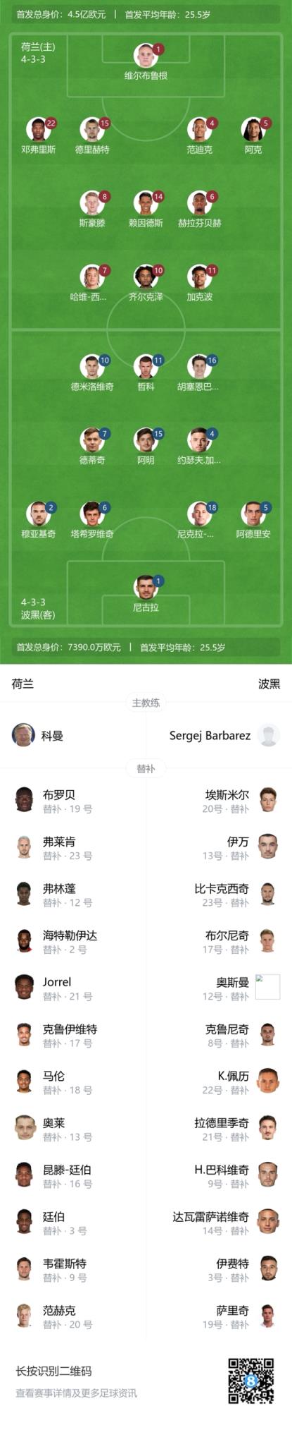 荷兰首发:1-维尔布鲁根、22-邓弗里斯、15-德里赫特、4-范迪克、5-阿克、8-斯豪滕、14-赖因德斯、6-赫拉芬贝赫、7-西蒙斯、11-加克波、10-齐尔克泽