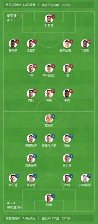 9月9日讯 欧国联A级A1组第二轮比赛,葡萄牙vs苏格兰,赛前首发名单公布。
