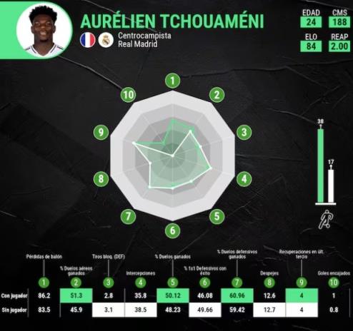 数据显示,琼阿梅尼上赛季的表现未能显著提升球队防守水平。在多项防守指标上,皇马无论他是否在场,表现几乎相同。与西甲同位置前10名球员相比,琼阿梅尼在多项数据上略显逊色,但在空中对抗和封堵射门方面表现出色。