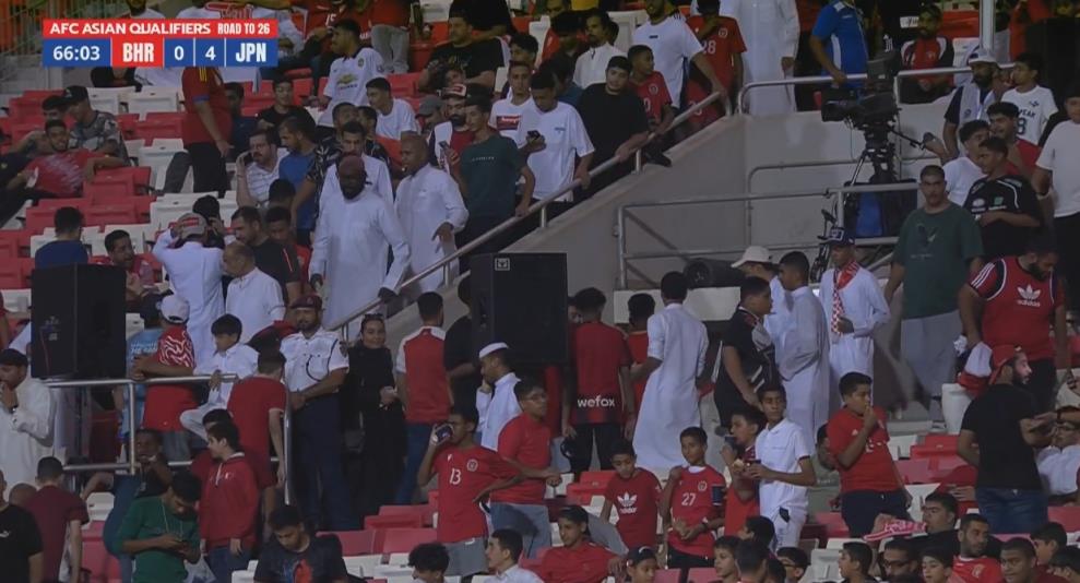 09月11日讯 日本vs巴林第64分钟,日本在3分钟内连入两球,比分改写为4-0。球员补水时,镜头给到看台,不少巴林球迷已经开始退场了。