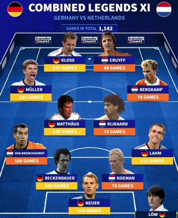 德转列荷兰vs德国合体传奇阵:共计为国出场1142场