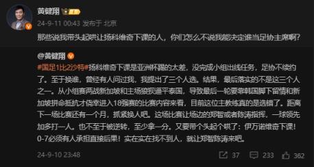 09月11日讯 18强赛第2轮,国足主场1-2遭十人沙特绝杀。赛后媒体人黄健翔发文谈到国足主帅,部分网友在评论区表示黄健翔曾力主换掉扬科维奇,媒体人黄健翔更新微博回应。