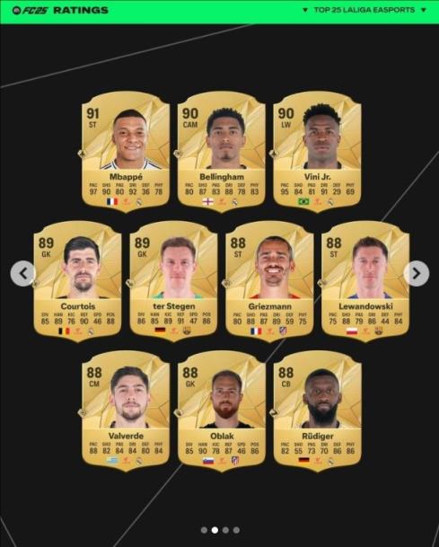 9月12日讯 EAFC官方公布EAFC25西甲球员评分最高的25位球员,姆巴佩91分领跑,贝林厄姆和维尼修斯均为90分。