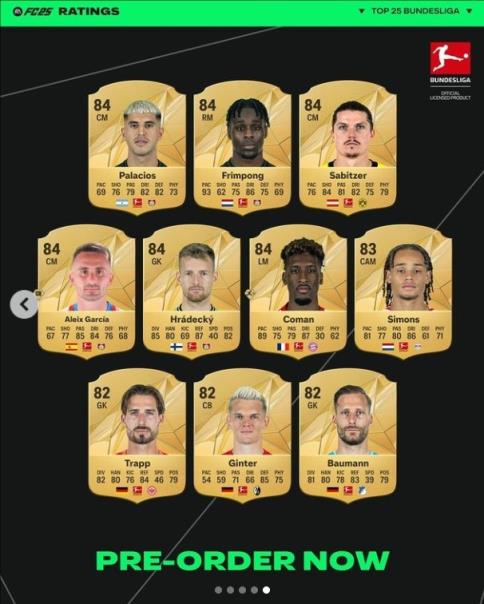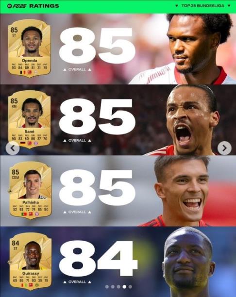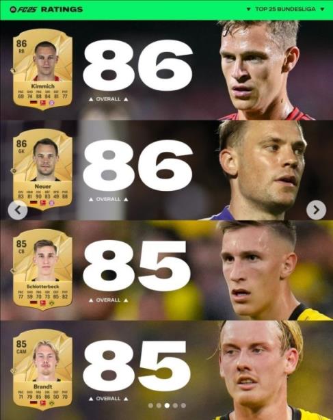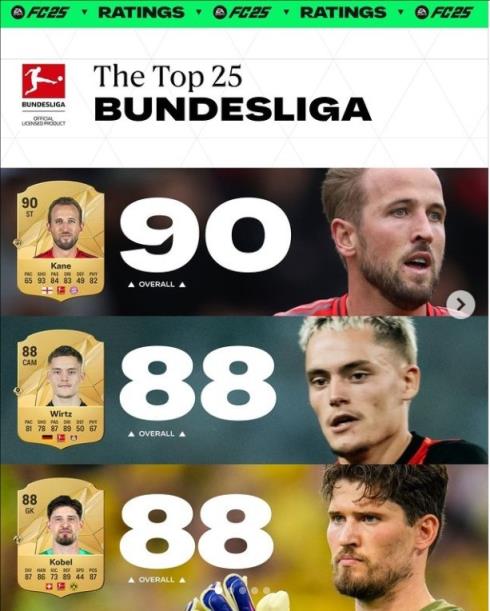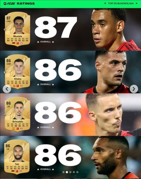 9月13日讯 EAFC官方公布EAFC25德甲球员评分Top25,凯恩90分钟居首,维尔茨第二,穆西亚拉第四。