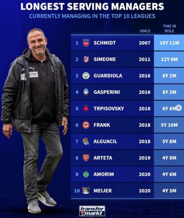 9月14日讯 《转会市场》统计了当前欧洲前十联赛的主帅任期情况,海登海姆主帅施密特以14年居首。