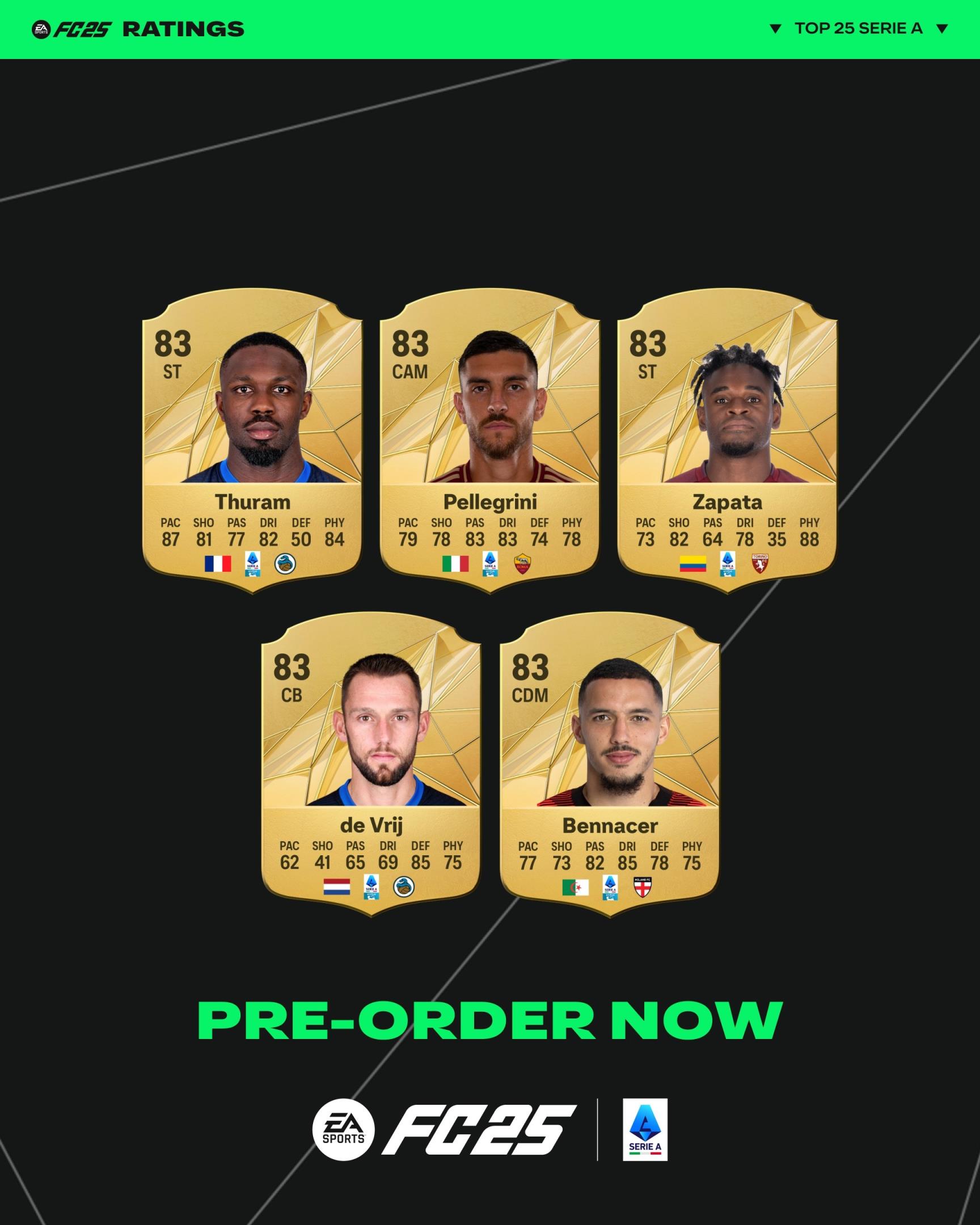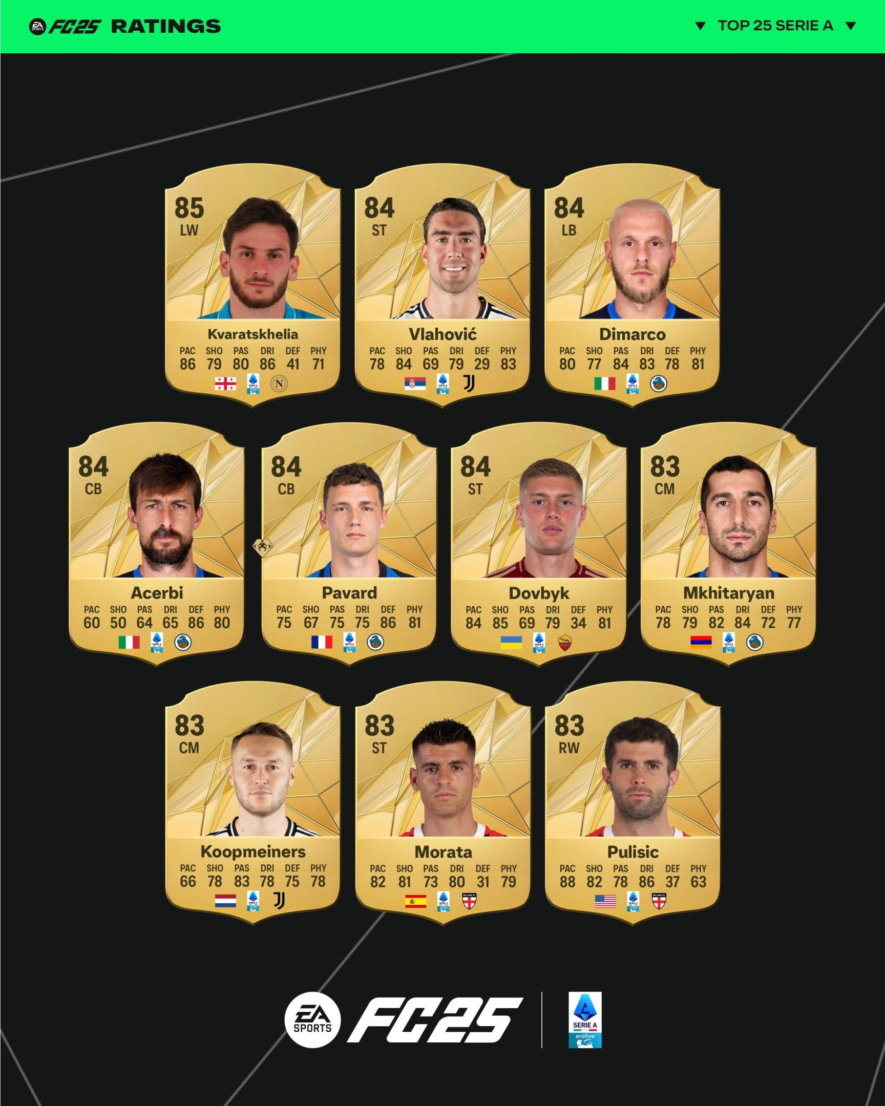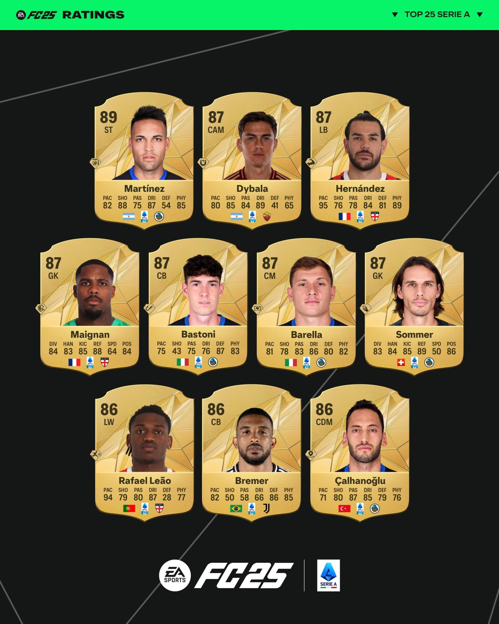 09月14日讯 EAFC25公布了意甲本赛季的球员评分前25,其中,国米前锋劳塔罗以89排名联赛第一。具体排名如下。