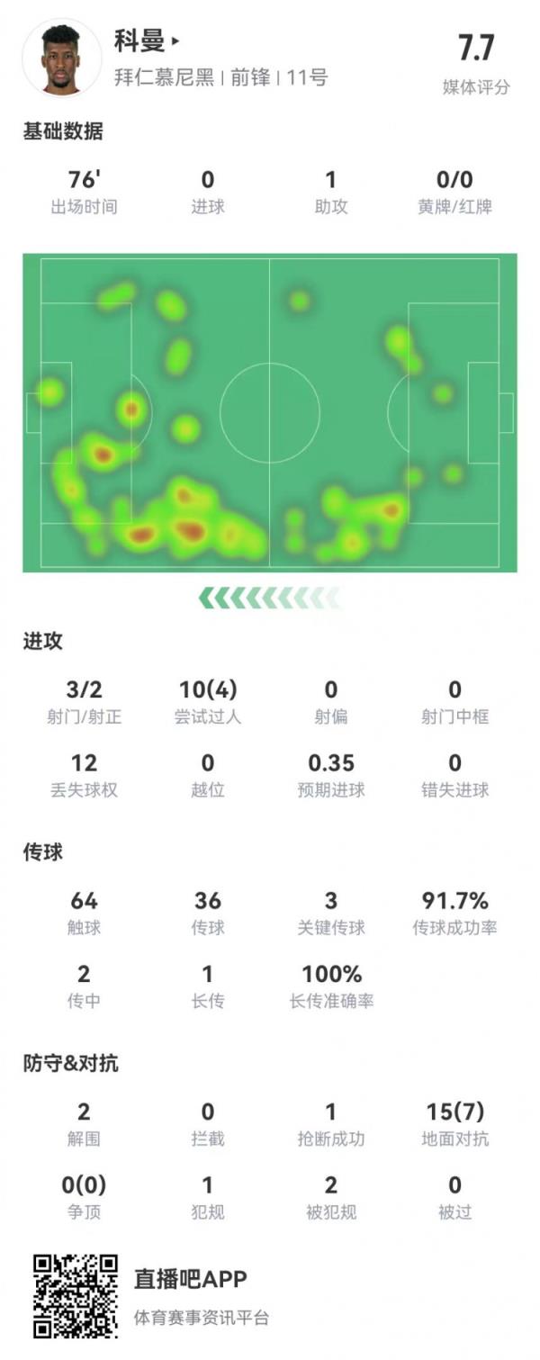 9月15日讯 拜仁在本轮德甲5-1领先基尔,科曼本场数据如下:
