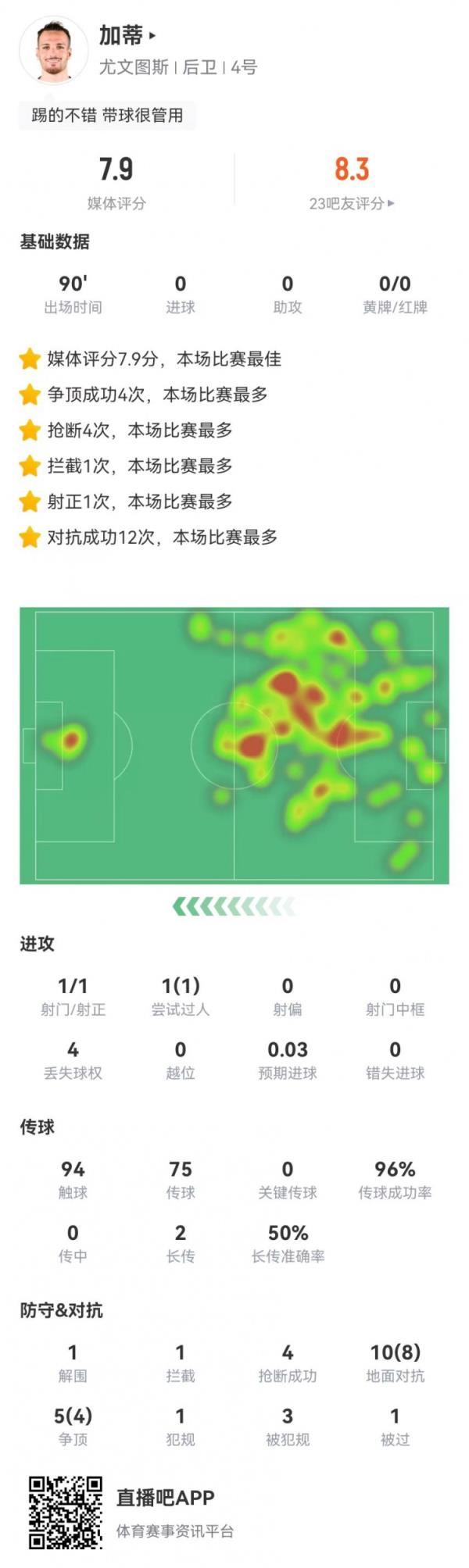 9月15日讯 尤文在本轮意甲0-0闷平恩波利,加蒂本场数据如下: