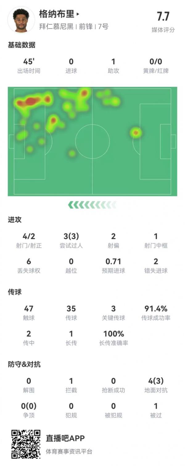 9月15日讯 拜仁在本轮德甲5-0领先基尔,格纳布里本场数据如下: