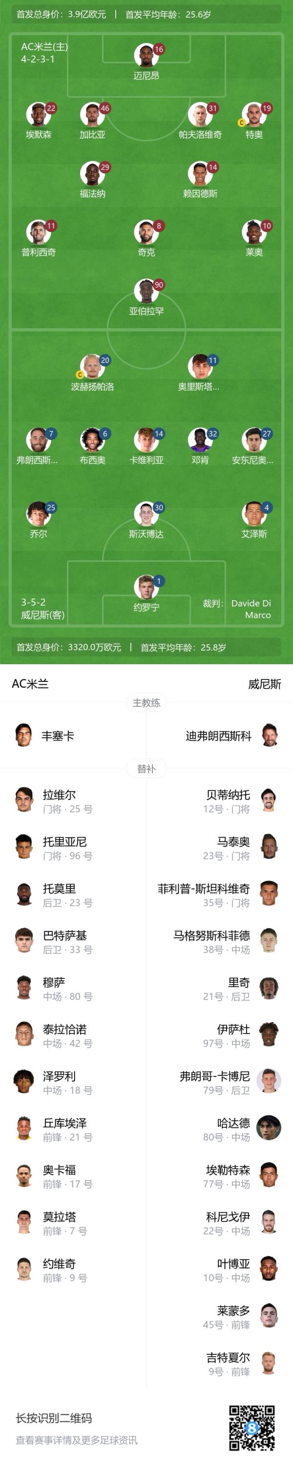 米兰首发:16-迈尼昂、22-埃默森、46-加比亚、31-帕夫洛维奇、19-特奥、29-尤素夫-福法纳、14-赖因德斯、8-奇克、11-普利西奇、10-莱奥、90-亚伯拉罕