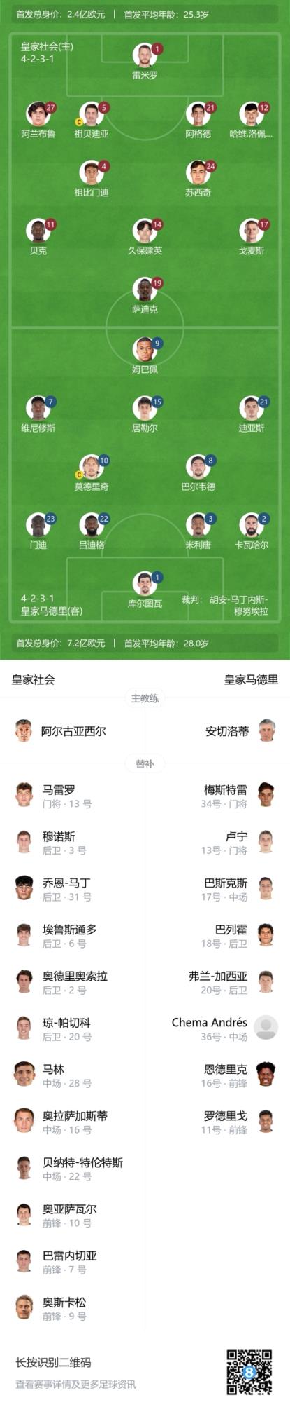 皇家社会替补:13-马雷罗、2-奥德里奥索拉、3-穆尼奥斯、6-埃卢斯通多、20-帕切科、31-乔恩-马丁、28-巴勃罗-马林、16-奥拉萨加斯蒂、22-图里安特斯、10-奥亚萨瓦尔、7-巴雷内切亚、9-奥斯卡松