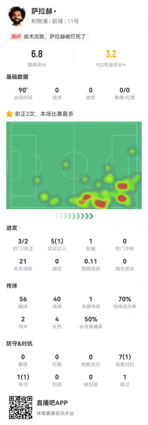 9月15日讯 利物浦在本轮英超爆冷主场0-1不敌诺丁汉森林,萨拉赫本场数据如下: