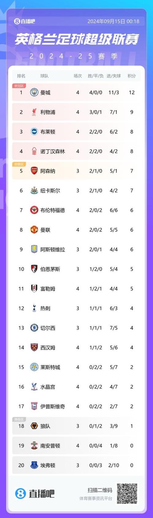 9月15日讯 英超第4轮,凭借哈兰德的梅开二度,曼城在主场2-1逆转击败布伦特福德,收获开赛季四连胜。
