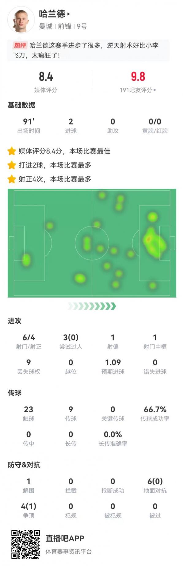 9月14日讯 曼城在本轮英超2-1击败布伦特福德,哈兰德本场数据如下:
