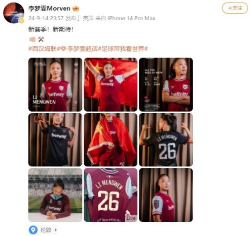今日李梦雯更新个人社媒,晒出了自己身穿西汉姆球衣的定妆照,并配文写道:“新赛季!新期待!”