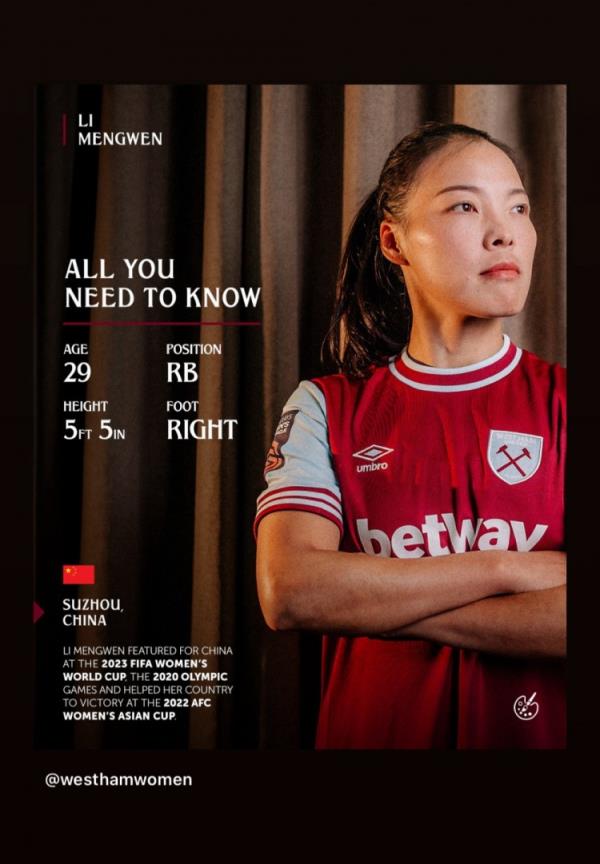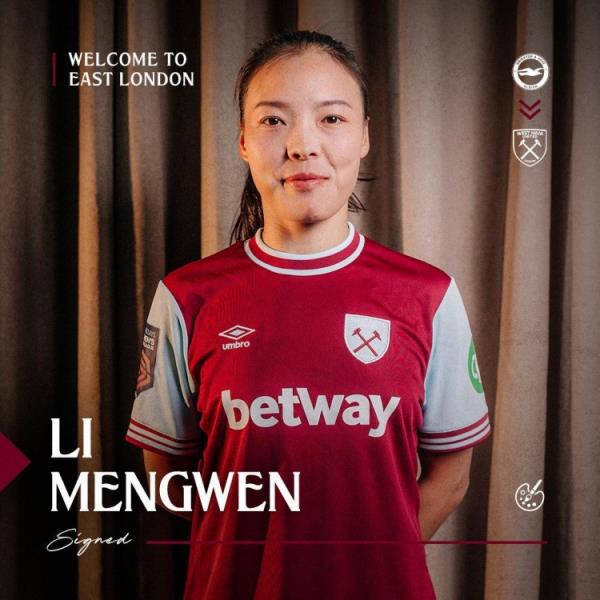 9月15日讯 官方消息,女足国脚李梦雯正式以租借方式从布莱顿女足加盟西汉姆女足,租期至赛季结束。她成为效力西汉姆的第一位中国球员。