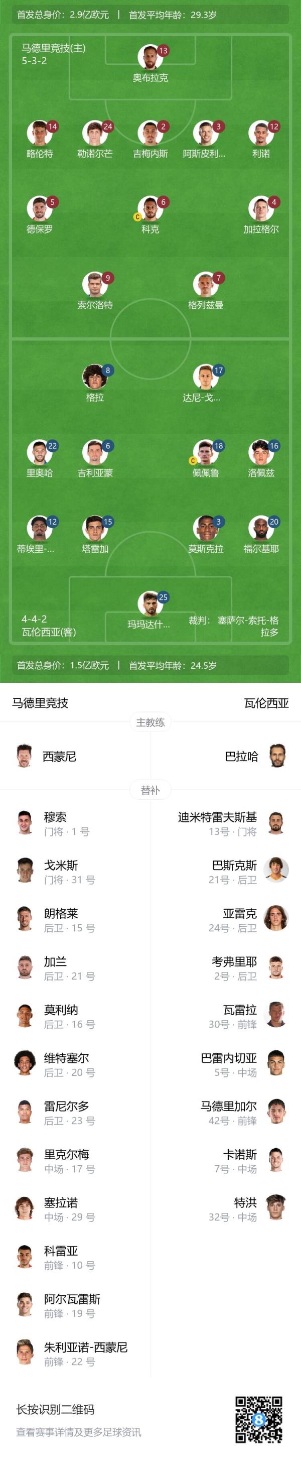 瓦伦西亚首发:25-玛玛达什维利、20-富尔基耶、3-莫斯克拉、15-塔雷加、12-蒂埃里-科雷亚、6-吉拉蒙、18-佩佩鲁、16-迭戈-洛佩斯、22-路易斯-里奥哈、8-古埃拉、17-达尼-戈麦斯