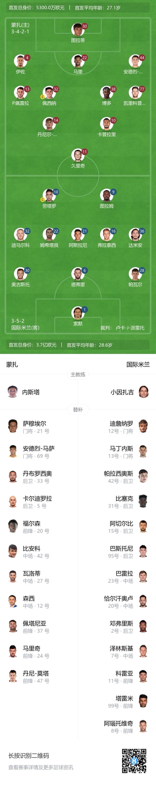 蒙扎首发:30-斯蒂法诺-图拉蒂、4-伊佐、22-马里、77-凯里科普洛斯、13-佩德罗-佩雷拉、44-安德烈-卡博尼、32-佩西纳、38-博多、14-丹尼尔-马尔蒂尼、10-卡普拉里、11-久里奇