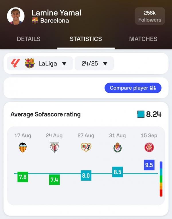 sofascore数据统计显示,亚马尔在本赛季西甲5轮比赛贡献3球4助攻,并5次制造重大机会,12次送出关键传球。