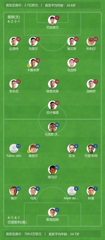 曼联首发:1-巴因德尔、5-马奎尔、10-拉什福德、14-埃里克森、17-加纳乔、18-卡塞米罗、20-达洛特、21-安东尼、25-乌加特、35-埃文斯、43-科利尔