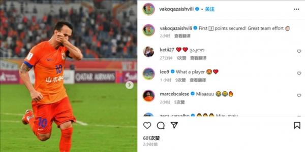 9月18日讯 泰山外援卡扎伊什维利更新社媒,庆祝球队取得亚冠开门红。