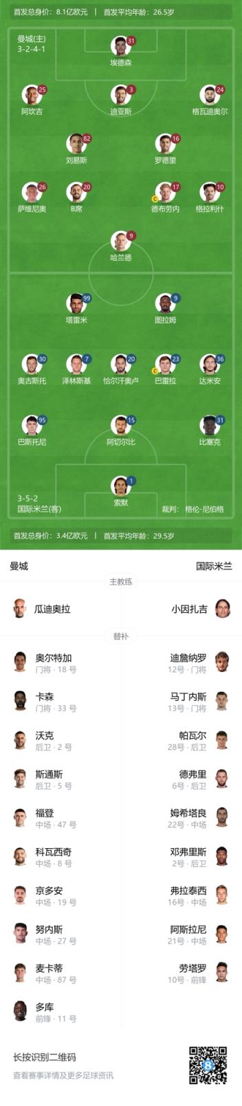 9月19日讯 欧冠联赛阶段第1轮比赛,曼城vs国米,赛前首发名单公布。