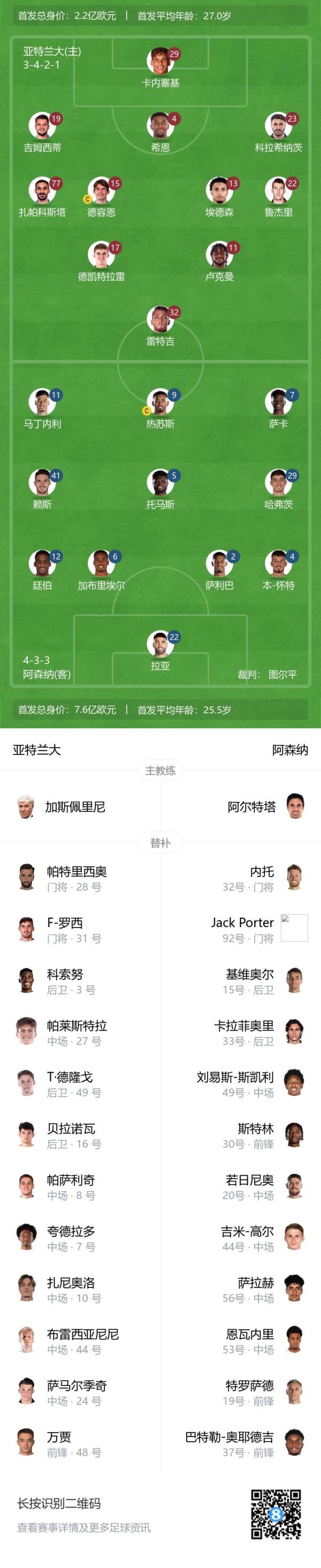 亚特兰大首发:29-卡内塞基、19-吉姆西蒂、4-希恩、23-科拉希纳茨、77-扎帕科斯塔、15-德容恩、13-埃德森、22-鲁杰里、17-德凯特拉雷、11-卢克曼、32-雷特吉