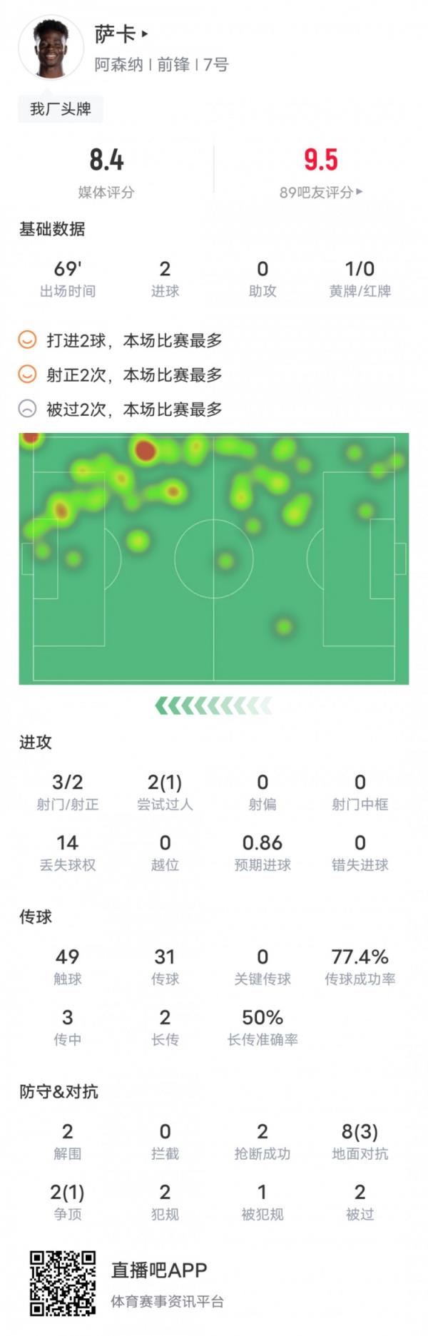 萨卡本场比赛具体数据如下: